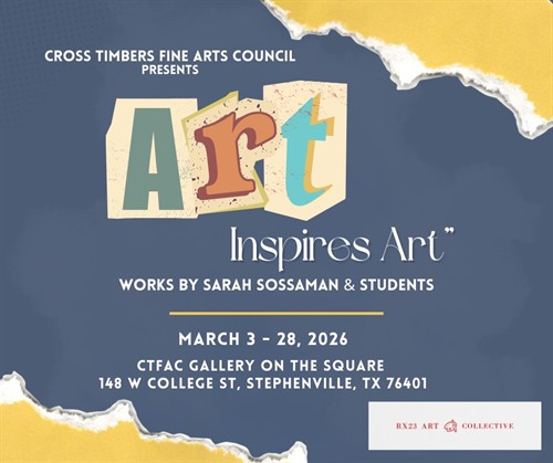 Join Cross Timbers Fine Arts Council at our Gallery on the Square for a vibrant showcase of creativity by Sarah Sossaman & her talented students. This exhibit bursts with color, imagination, & the kind of inspiration you can feel the moment you walk in. On display March 3-28, 2026.