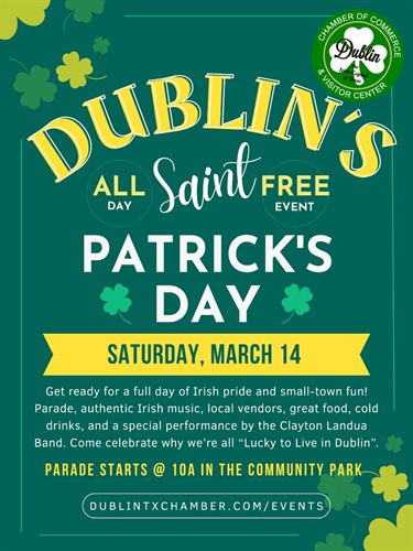 Name: Dublin's St. Patrick's DayDate: March 14, 2026Time: 10:00 AM - 10:00 PM CDTWebsite: Click here to visit our website!