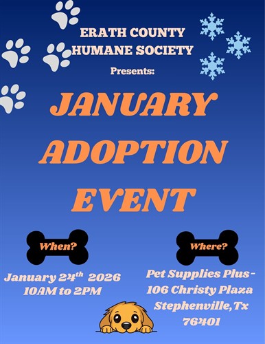 Name: Erath County Humane Society January Adoption EventDate: January 24, 2026Time: 10:00 AM - 2:00 PM CSTWebsite: Click here to follow us on Facebook!