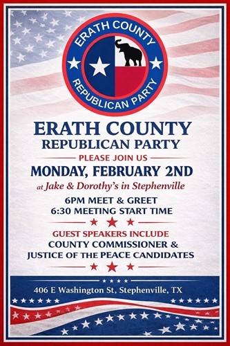 Name: Erath County Republican Party Monthly MeetingDate: February 2, 2026Time: 6:00 PM - 8:00 PM CSTWebsite: Click here to follow us on Facebook!