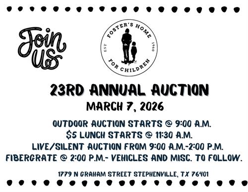 Name: Foster's Home 23rd Annual AuctionDate: March 7, 2026Website: Click here to visit our website!