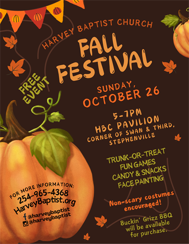 Name: Harvey Baptist Church Fall FestivalDate: October 26, 2025Time: 5:00 PM - 7:00 PM CDTWebsite: Click here to visit our website!Event Description: