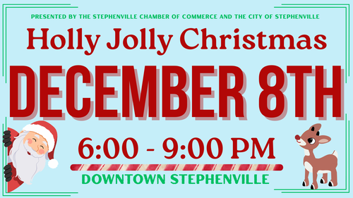 The Chamber is excited to partner with the City of Stephenville to organize a family-fun community event that celebrates Christmas, showcases talented local youth singers and dancers, provides fundraising opportunities for area non-profit organizations, and allows local businesses to promote their products to holiday shoppers. The best part of the entire evening is getting to celebrate this joyous time of year with family and friends in this community we all love! You will definitely leave with that child-like feeling of Christmas still resonating in your soul!