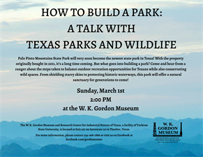 Come and hear from a ranger about the steps taken to balance outdoor recreation opportunities for Texans while also conservating wild spaces. From shielding starry skies to protecting historic waterways, this park will offer a natural sanctuary for generations to come!