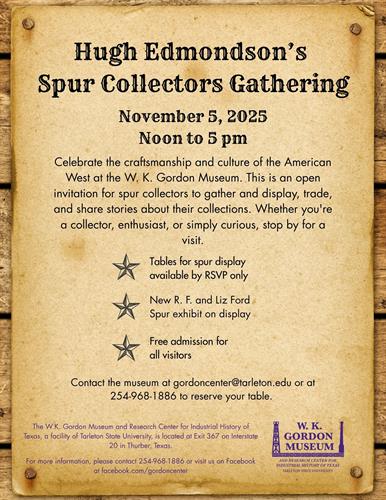 This is an open invitation for spur collectors to gather and display, trade, and share stories about their collections. Whether you're a collector, enthusiast, or simply curious, stop by for a visit.