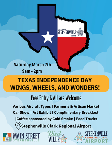 Celebrate Texas Independence Day at the Wings, Wheels, and Wonders event at the Stephenville Clark Regional Airport!